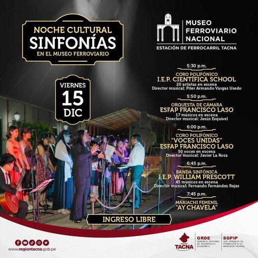 La gente del Gobierno Regional y del Museo Ferroviario invitan a la comunidad tacneña y visitantes a una nueva Noche Cultural Sinfonías en el Museo Ferroviario. En esta ocasión presentándose los Coros Polifónicos de la I.E.P. Científica School, de la ESFAP Fracisco Lazo, su Orquesta de Cámara, la Banda Sinfónica del I.E.P William Prescott y el Mariachi Femenil «Ay, Chavela». La cita musical empieza a las 5:30 PM y el ingreso es libre.
