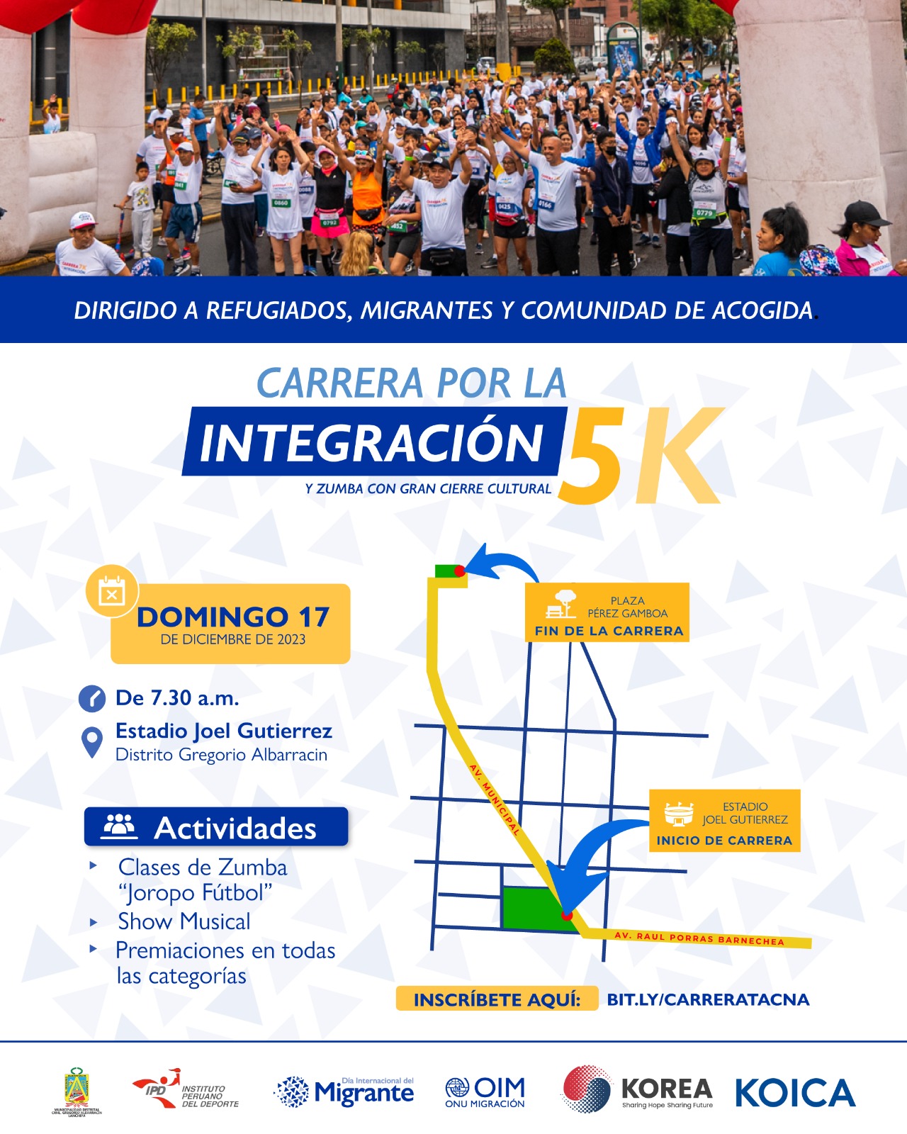 La Municipalidad Distrital de Coronel Gregorio Albarracín Lanchipa organiza dirigido a los refugiados, migrantes y comunidad de acogida el evento Carrera por la Integración 5K, desde las 7:30 PM en el Estadio Joel Gutiérrez como punto de partida hasta la Plaza Perez Gamboa, donde adicionalmente se realizarán clases de zumba y un show musical. La inscripción para la carrera se realiza por este enlace.- Padoru Fest 2023, id.