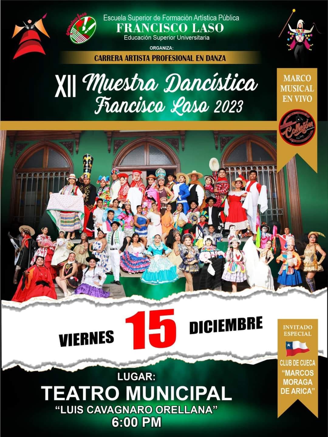A las 6:00 PM en el Teatro Municipal, la ESFAP Francisco Laso presentará su XII Muestra Dancística Francisco Laso 2023, teniendo como invitados especiales al Club de Cueca Marcos Moraga de Arica.