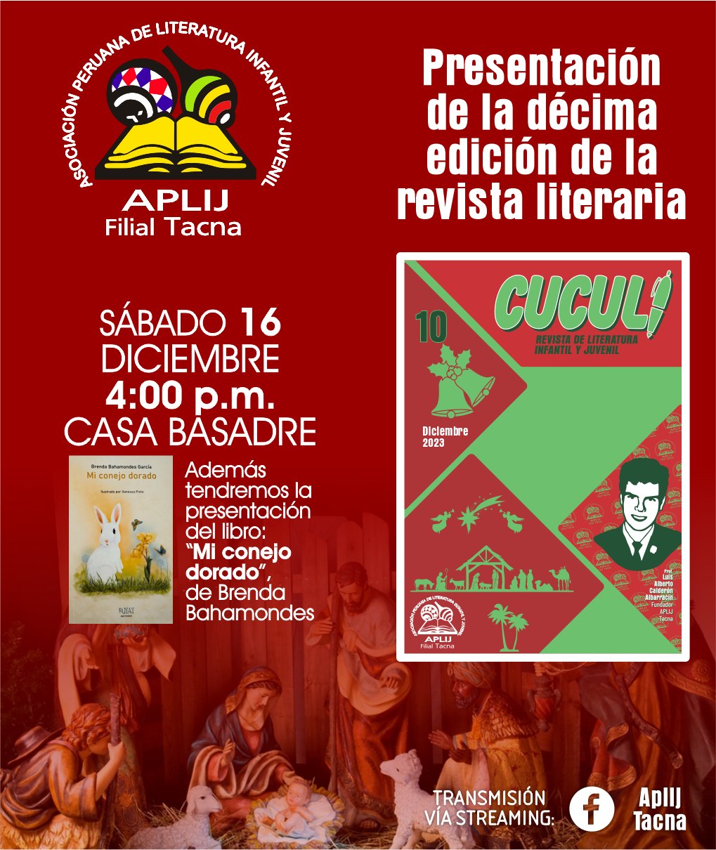 La Asociación Peruana de Literatura Infantil y Juvenil – Filial Tacna presentará a las 4:00 PM en la Casa Basadre la décima edición de su revista literaria Cuculi. Adicionalmente, Brenda Bahamondes presentará su libro Mi Conejo Dorado.