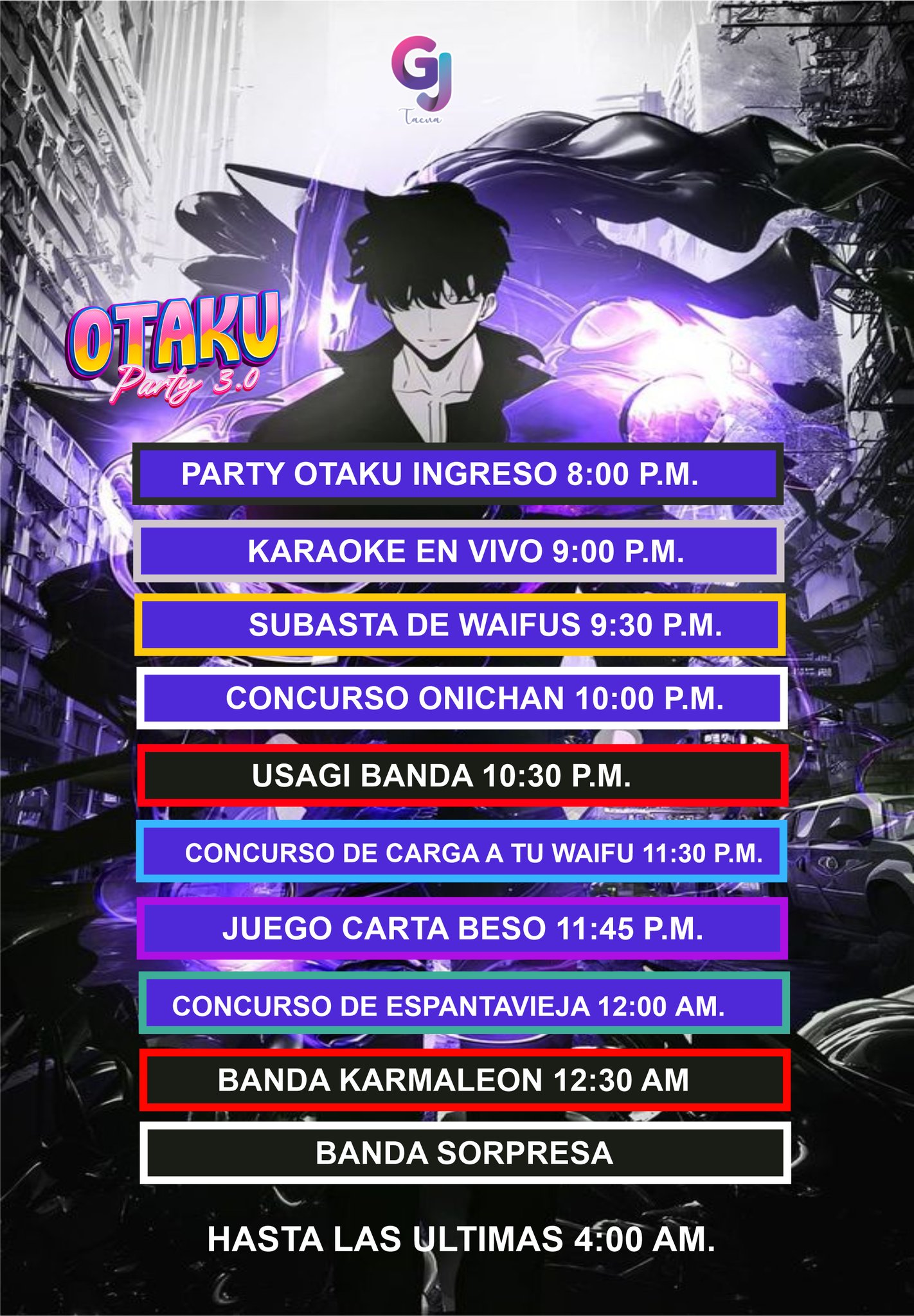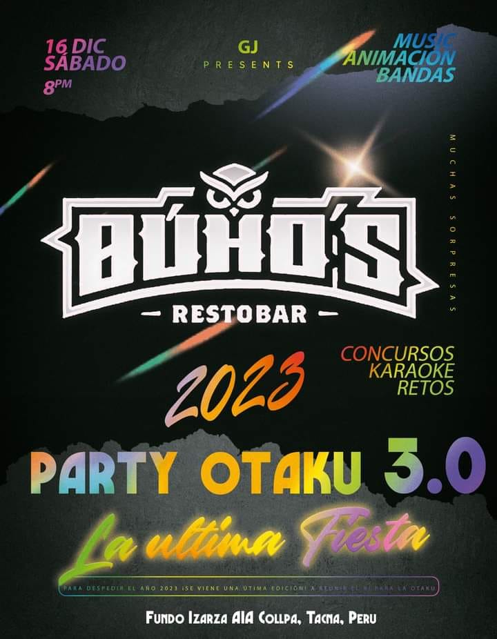 En el local Buho’s Restobar (Fundo Izaiza A1A Collpa) se realizará el Party Otaku 3.0 La Última Fiesta organizado por Generación Juvenil Tacna, Diversos concursos con premios desde las 8:00 PM hasta las últimas (4:00 AM).
