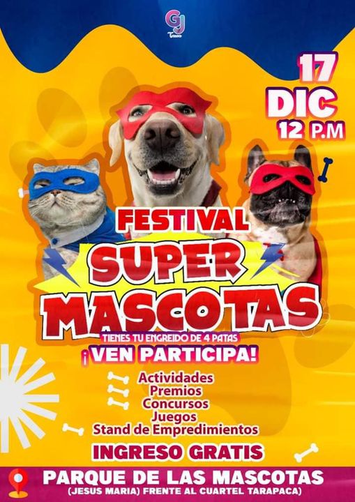 Organizado por Generación Juvenil Tacna desde las 12:00 PM en el Parque de las Mascotas (frente al Cuartel Tarapacá en Jesús María) se celebrará el evento Festival Super Mascotas, constituido por diversas actividades con consursos, juegos, premios y exhibiciones. El ingreso es gratuito.Si quieres participar en el concurso entra acá https://forms.gle/YVYiEjg7MFdeTBrc7. Más información, llamar al 928-606908.