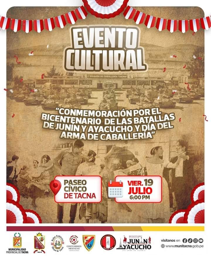 La Municipalidad Provincial de Tacna junto a la Tercera Brigada de Caballería llevará a cabo en el Paseo Cívico el evento cultural Conmemoración por el Bicentenario de las Batallas de Junín y Ayacucho y Día del Arma de Caballería. Será a partir de las 6:00 PM.