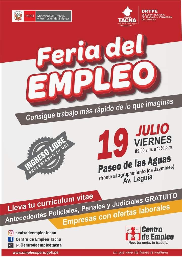 En el Paseo de las Aguas (a la altura del Agrupamiento Los Jazmines) la Dirección Regional de Trabajo y Promoción del Empleo de Tacna llevará a cabo desde las 9:00 AM una nueva Feria del Empleo.