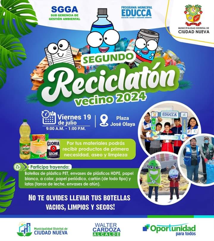 En la Plaza José Olaya la Municipalidad Distrital de Ciudad Nueva convoca a la población al Segundo Reciclatón Vecino 2024, donde se acopiará material reciclable por el que se entregará víveres de primera necesidad, productos de aseo y limpieza. Empieza a las 9:00 AM hasta la 1:00 PM.