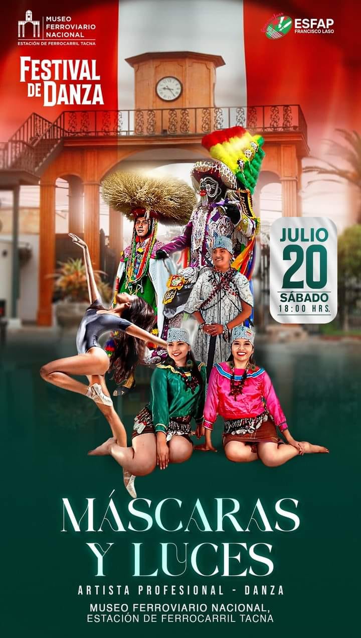 La ESFAP Francisco Laso presentará su espectáculo gratuito Festival de Danzas Máscaras y Luces en el Anfiteatro de la plaza José Olaya de Ciudad Nueva desde las 5:00 PM.