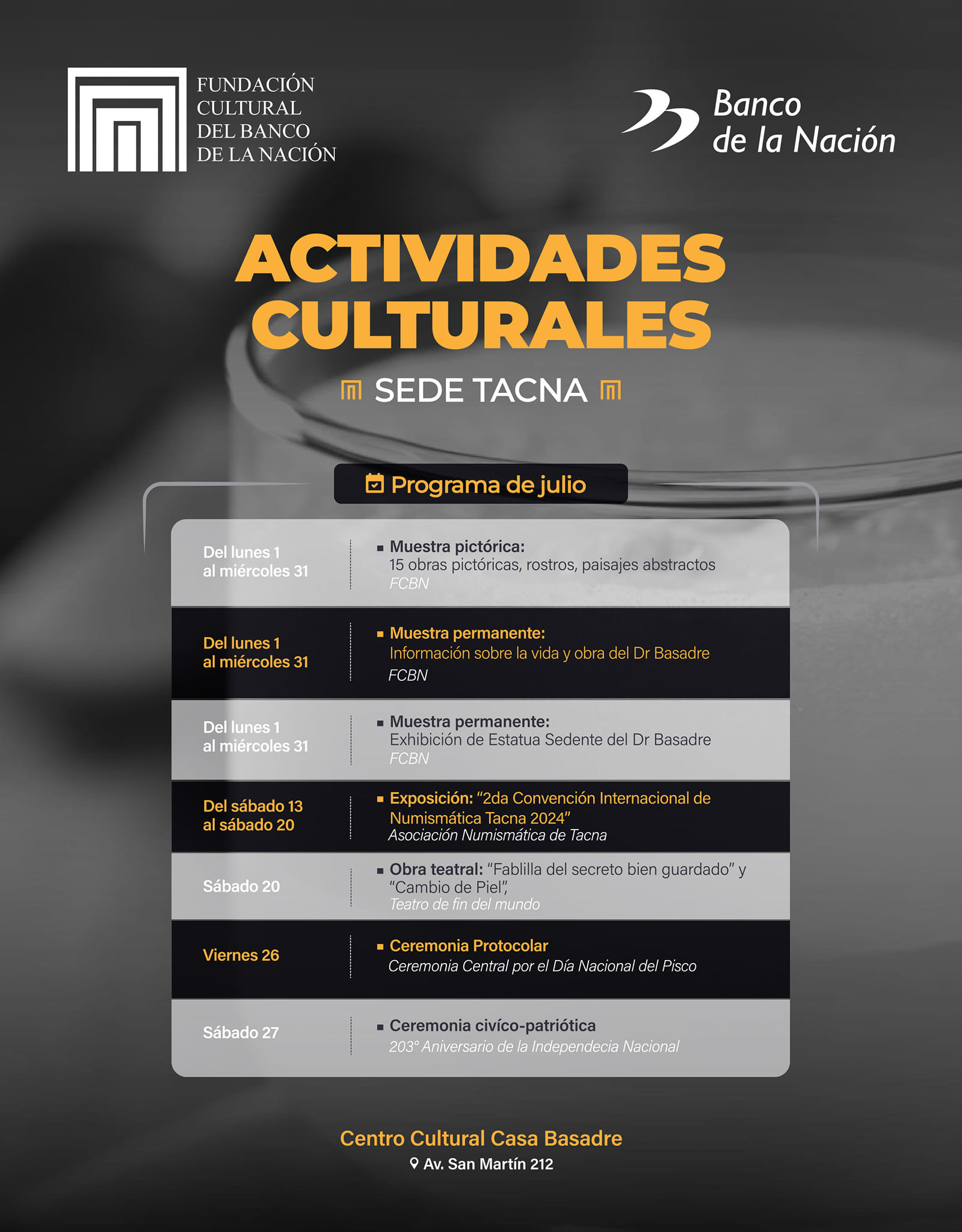 En la Casa Basadre se estarán llevando durante el mes de julio varias actividades, como una Muestra Pictórica de 15 obras pictóricas, la Muestra permanente de la vida y obra del Dr. Jorge Basadre, y la penúltima fecha de la 2da Convención Internacional de Numismática Tacna 2024, organizada por la Asociación Numismática de Tacna. Todo en el local de la Casa Basadre, en Av. San Martín N° 212.