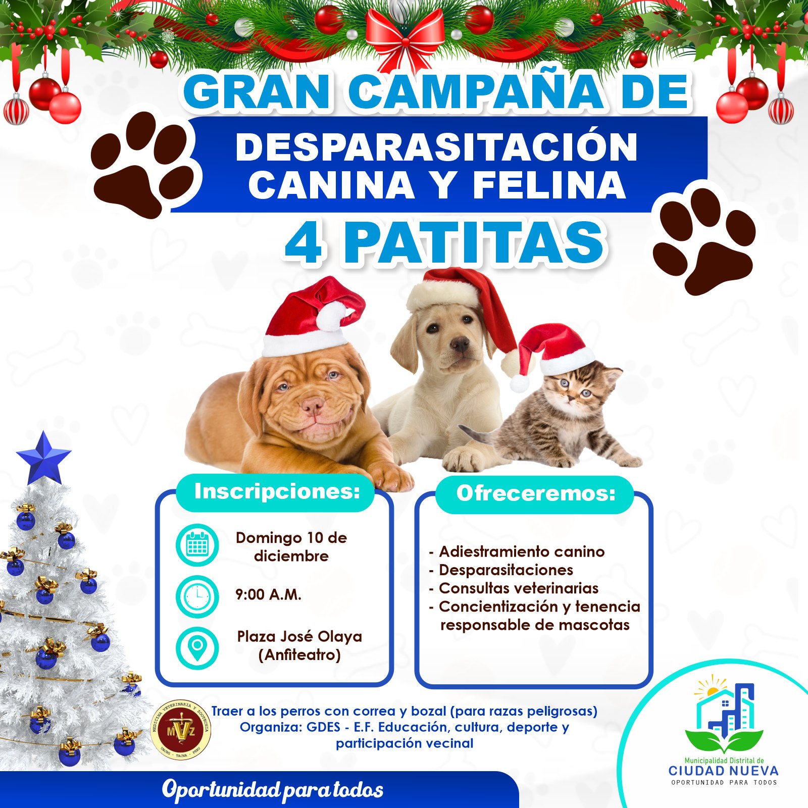 La Municipalidad Distrital de Ciudad Nueva invita a la colectividad a la Gran Campaña de Campaña de Desparasitación Canina y Felina 4 Patitas. Será desde las 10:00 AM en la Plaza José Olaya.