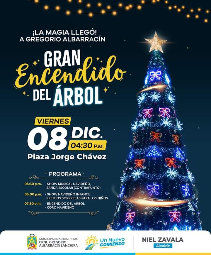 • La Municipalidad Distrital de Coronel Gregorio Albarracín Lanchipa procederá al Gran Encendido de su Árbol Navideño (que promete superar en altura al de la Municipalidad Provincial) en la Plaza Jorge Chávez. Será a partir de la 4:30 PM, con shows y premios sorpresa para los niños asistentes.