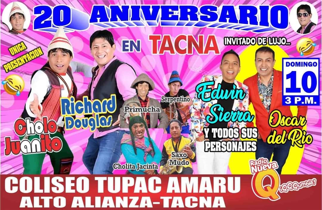 • El popular dúo cómico Cholo Juanito y Richard Douglas por su 20 aniversario vienen a Tacna con dos invitados de lujo, Edwin Sierra y Óscar del Río. En el Coliseo Túpac Amaru de Alto Alianza desde las 3 PM. Entradas a la veta en el mismo coliseo desde las 9:00 AM.