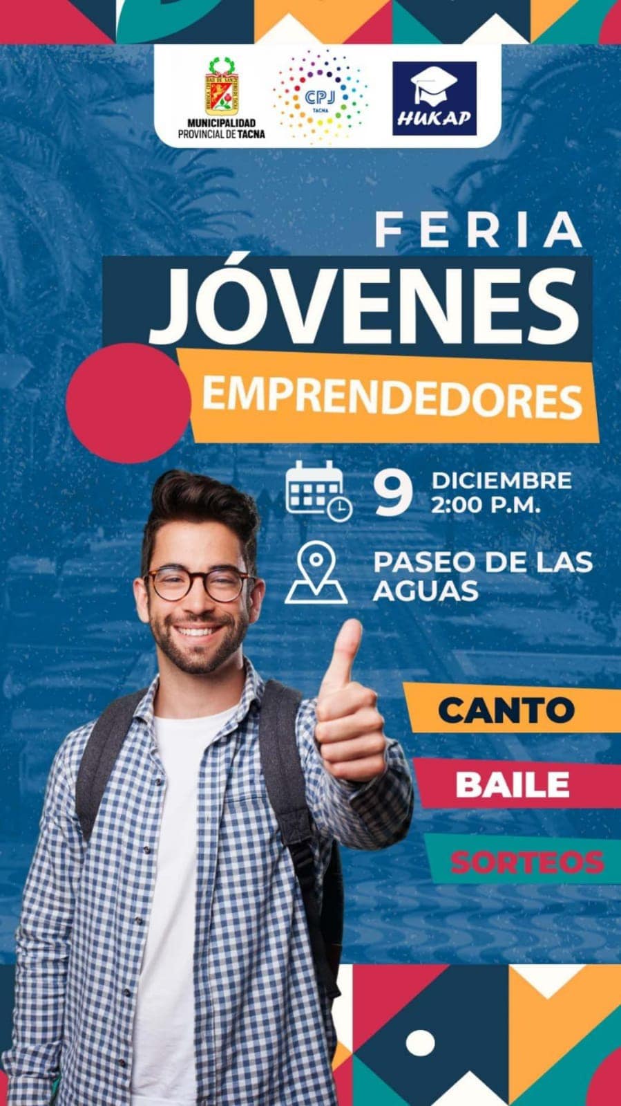 • La Municipalidad Provincial de Tacna realizará en el Paseo de las Aguas a partir de las 2:00 PM la Feria Jóvenes Emprendedores. Habrá animación, baile, canto y sorteos.