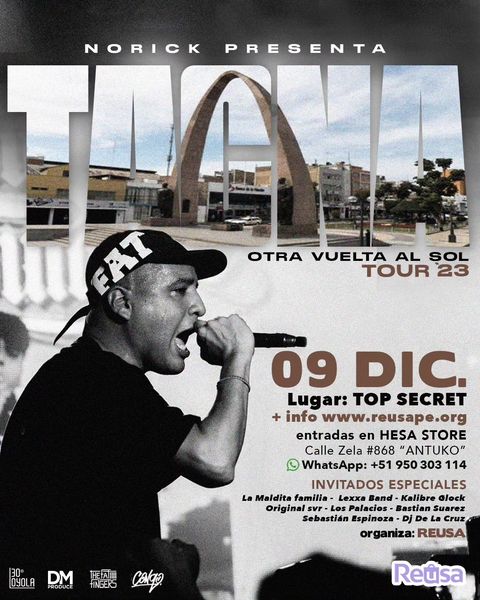 • Norick Rapper School en Tacna en el local del  Complejo Recreacional SITRAMUN de Para. A partir de las 4:00 PM. Puedes ver si aún encuentras entradas en línea a través de http://www.reusape.org o de forma física en Hesa Store (Calle Zela #868 “ANTUKO”). Informes al 950-303114.