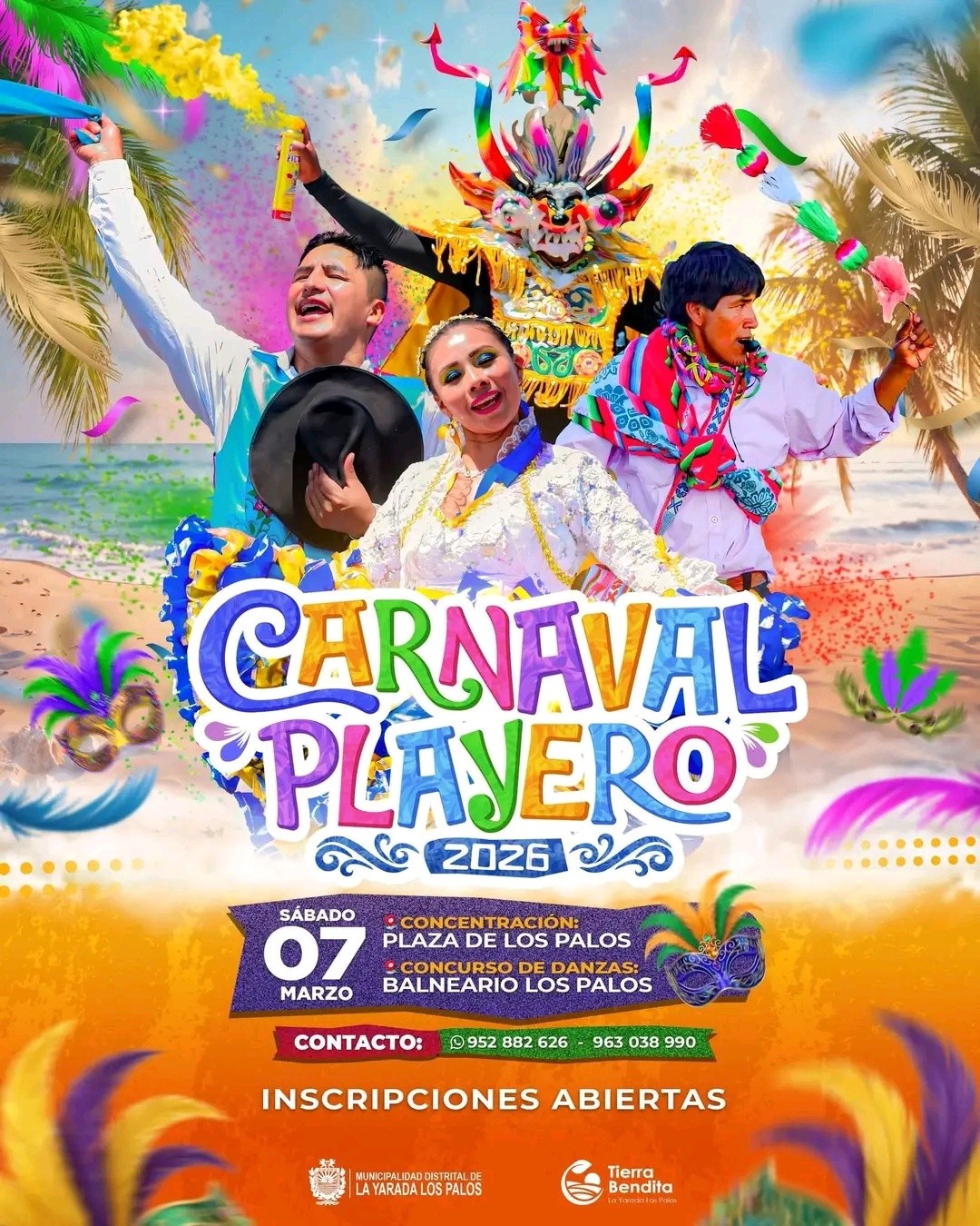 Carnaval Playero 2026 en el Balneario Los Palos, con comparsas, danzas, música y concurso. La concentración se hará en la Plaza de los Palos.- Cineplanet Tacna, id.