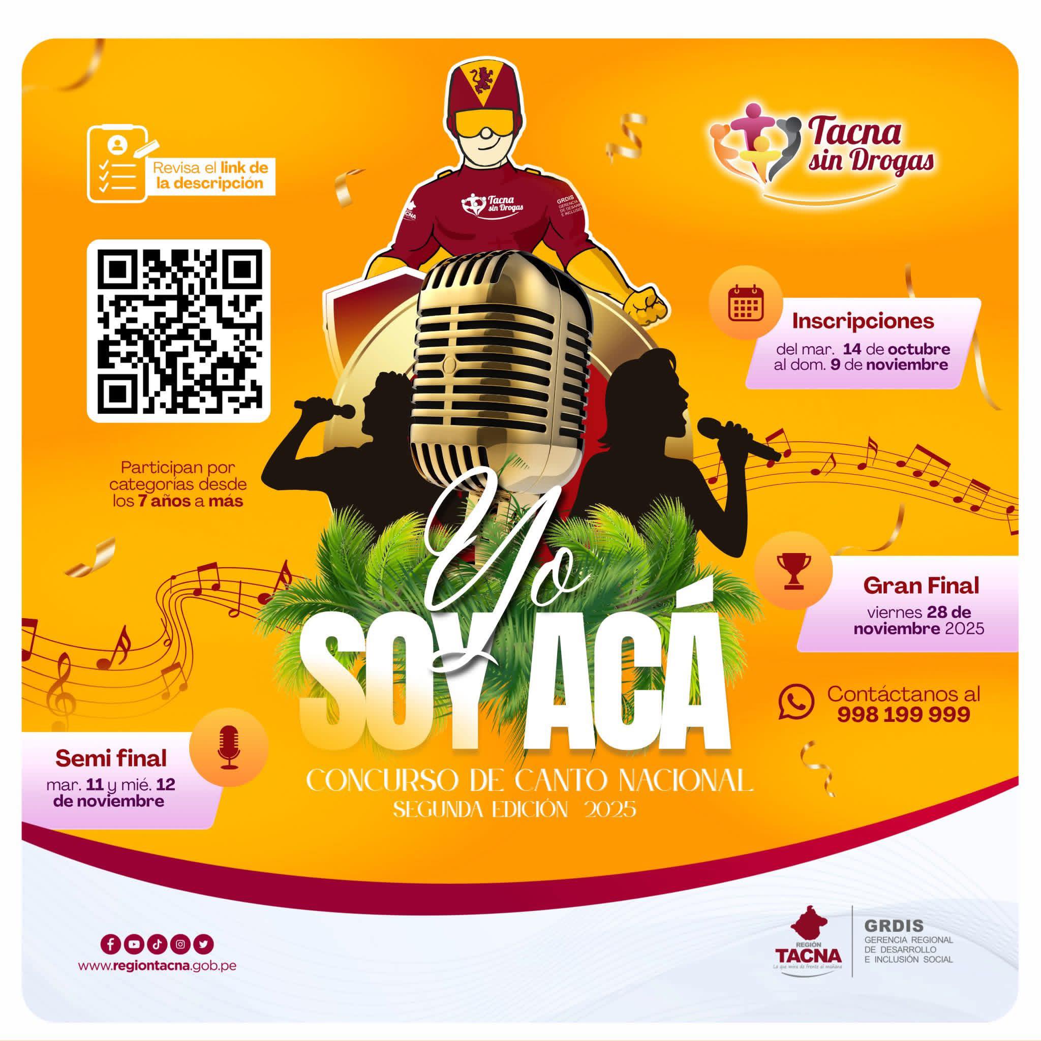 Primera fecha de la semifinal de la Segunda Edición del Concurso de Canto Nacional Yo Soy Acá. Organizada por el Gobierno Regional de Tacna, a través del Proyecto Tacna Sin Drogas de la Gerencia Regional de Desarrollo e Inclusión Social.