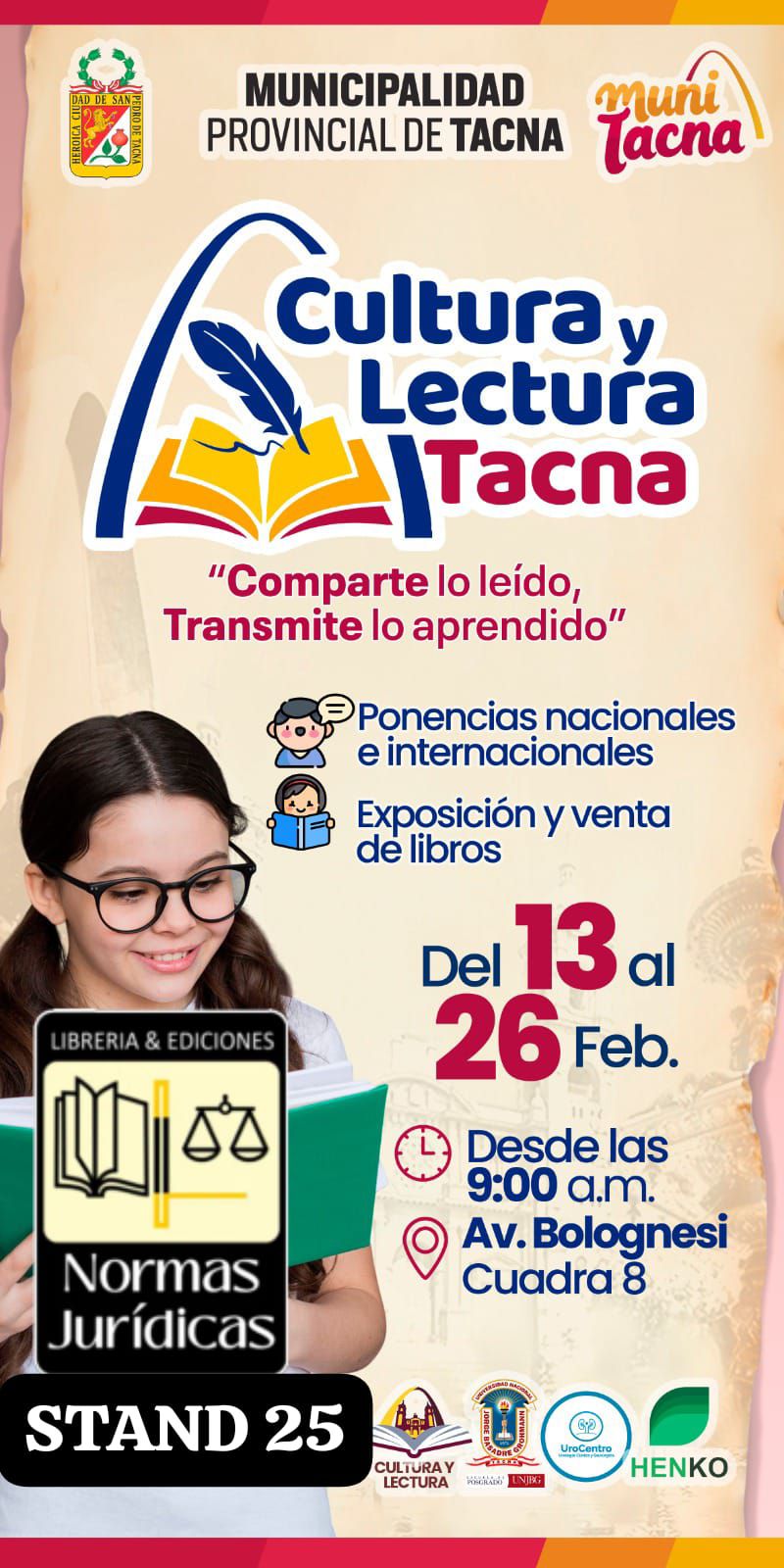 • Feria Cultura y Lectura Tacna en la cuadra 8 de la Av. Bolognesi (frente al Mercado Central). La Feria se realizará hasta el 26 de febrero