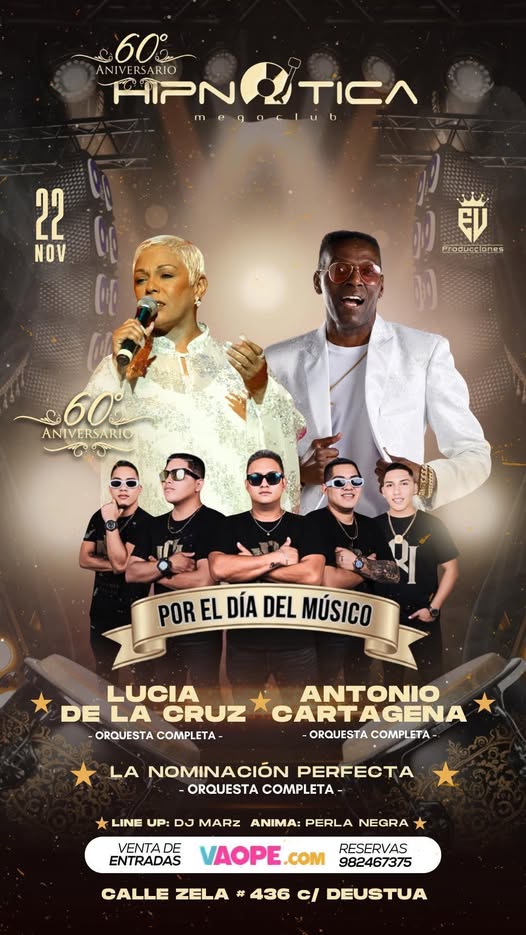 Por el Día del Músico en Hipnótica Mega Club (Calle Zela con Deustua N° 436) se presentarán Lucía de la Cruz, Antonio Cartagena y la orquesta La Nominación Perfecta. Informes y reservas al 982 467.