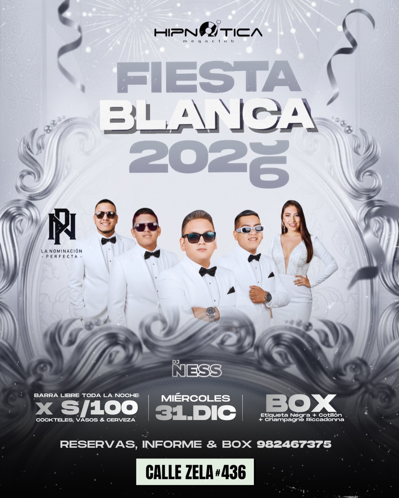 Fiesta Blanca 2026 en Hipnótica (calle Zela N° 436). Show en vivo: La Nominación Perfecta, DJ invitado: DJ Ness. Box: etiqueta negra, cotillón y champagne Riccadona. Bara libre toda la noche a S/ 100. Informes y reservas al 982 467 375.