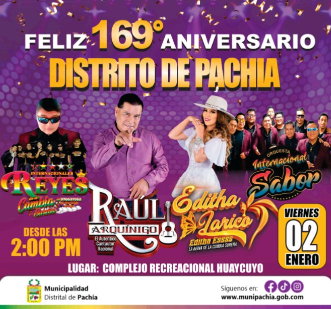 Fiesta por el 169° Aniversario del distrito de Pachía con la presentación de Los Internacionales Reyes de la Cumbia, Raúl Arquínigo, Editha Larico y la Orquesta Internacional Sabor. Empieza a las 2:00 PM en el Complejo Recreacional Huaycuyo.