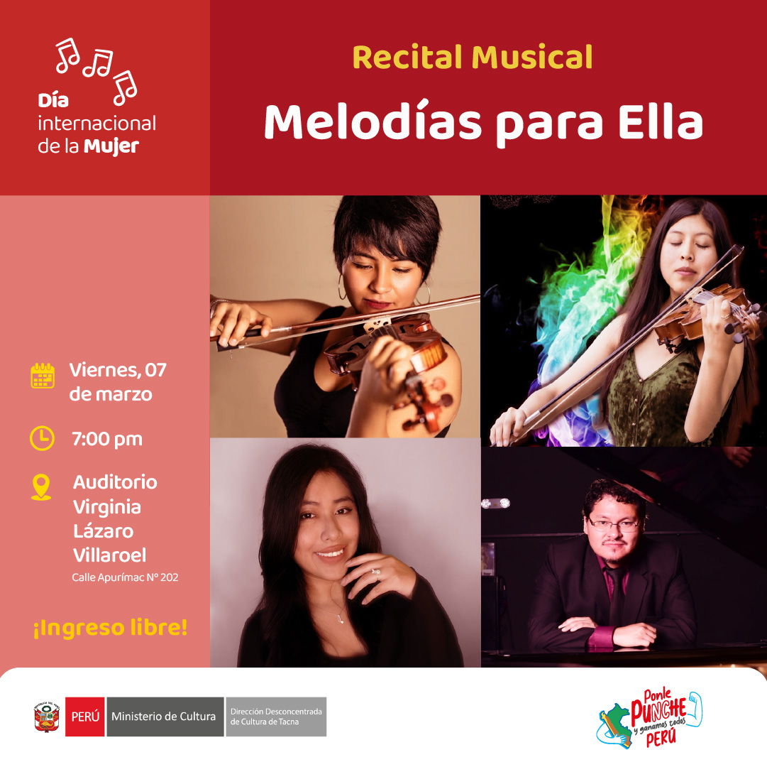 La Dirección Desconcentrada de Cultura de Tacna organiza el recital musical Melodías para Ella por el Día Internacional de la Mujer. Se hará en Auditorio Virginia Lázaro Villaroel de calle Apurímac N° 202. Entrada libre desde las 7:00 PM. Participan los músicos: Ian Fernández González, Debora Turpo Chura, Lucia Tapia Medina y Luisa Salazar Juuypa.