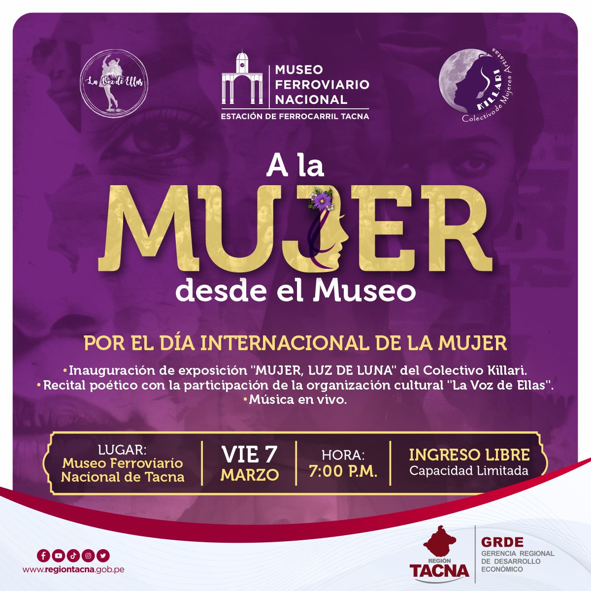 El Museo Ferroviario de Tacna por el Día Internacional de la Mujer llevará a cabo el evento artístico-cultural A la Mujer desde el Museo que consistirá en la inauguración de la exposición Mujer: Luz de Luna, del Colectivo Killari, un recital poético a cargo de la organización cultural La Voz de Ellas, además de música en vivo. Será en el local del museo a partir de las 7:00 PM. Entrada libre y cupos limitados.