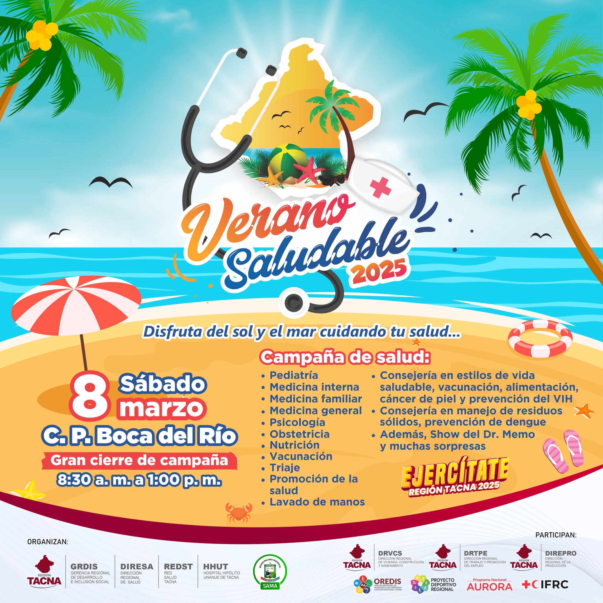 En la playa Boca del Río el Gobierno Regional llevará a cabo la campaña de salud Verano Sadudable 2025 por el 36 aniversario del centro poblado. Será de las 8:30 AM hasta la 1:00 PM.
