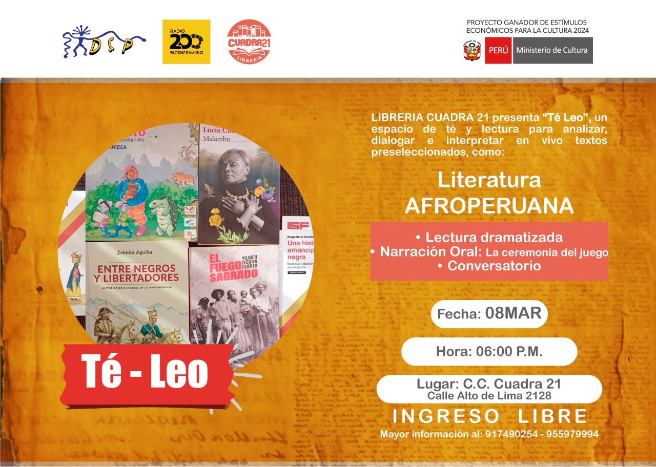 La Librería Cuadra 21 presenta Té Leo, su espacio para analizar, dialogar e interpretar textos preseleccionados acompañados de un té. En esta ocasión dedicada a la literatura afroperuana. Lugar: Centro Cultural Cuadra 21 en Alto de Lima N° 2128, media cuadra más abajo de la Av. Basadre y Forero. Desde las 6:00 PM. Entrada libre.