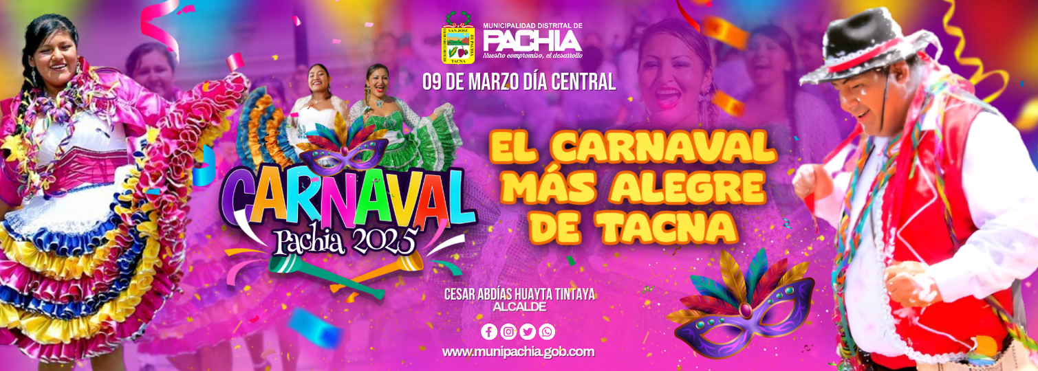 Con el tradicional Pasacalle a iniciarse a las 9:00 AM en la Av. Arias Aragüez del distrito de Pachía se inicia el día central de celebración del Carnaval Pachía 2025. Concursos de comparsas, elección y coronación de la Reyna del Carnaval en el Centro Recreacional Huaycuyo.