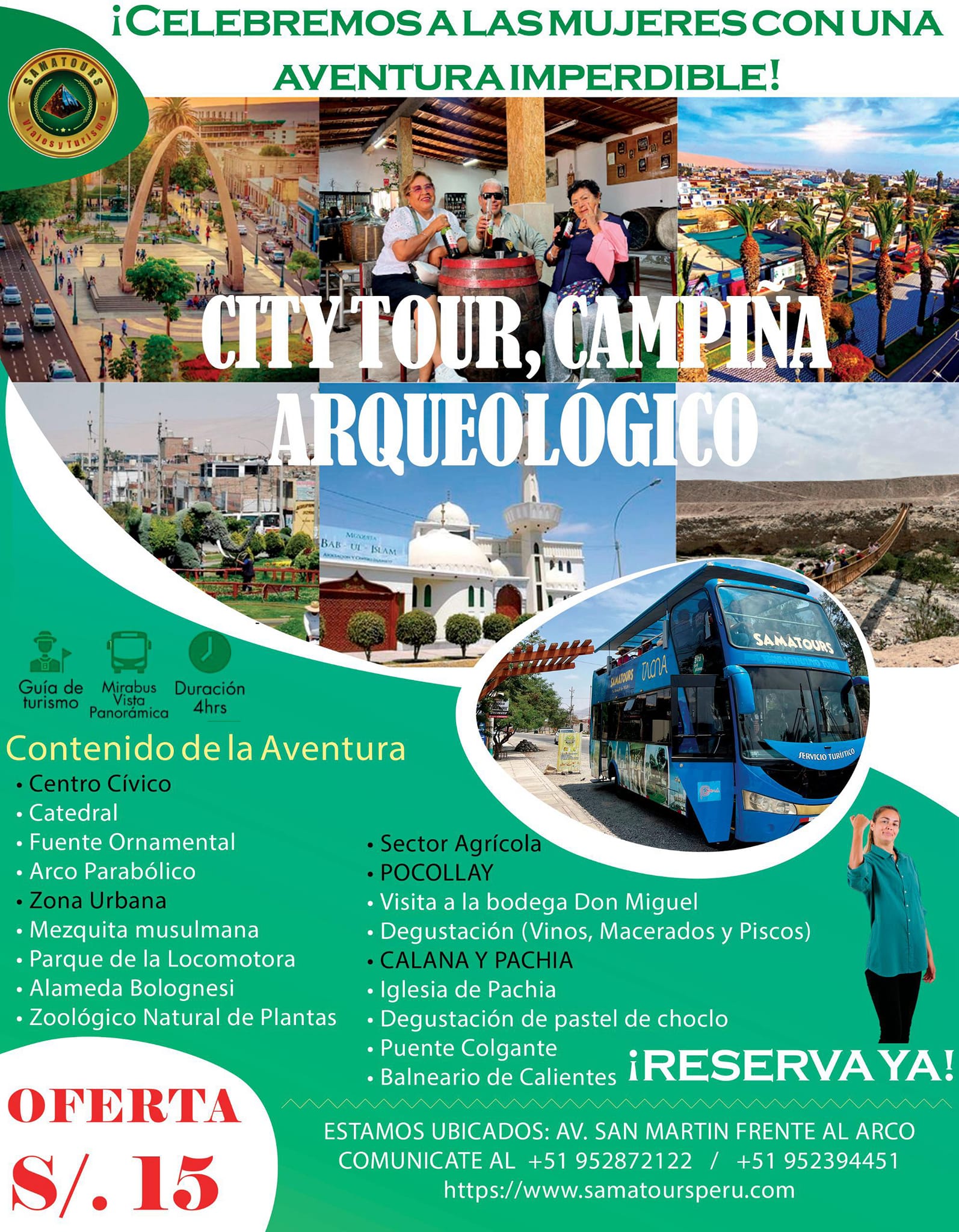 La empresa Samatours por la fecha ha programado un City Tour Campiña Arqueológico a S/ 15 precio especial mujeres, con sorteos y sorpresas para las asistentes. Parte a las 9:30 AM en su local de Av. San Martín 321 frente al Arco Parabólico. Informes al +51 952872122 ó +51 952394451.