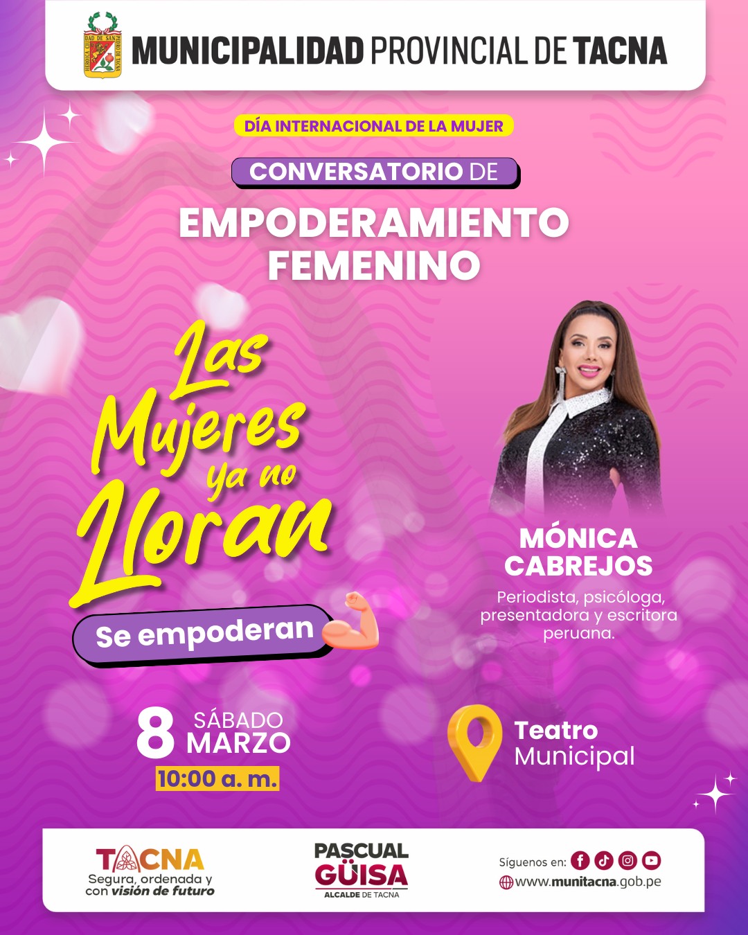 En el Teatro Municipal la Municipalidad Provincial de Tacna llevará a cabo el conversatorio Las Mujeres Ya No Lloran Se Empoderan, con la participación de la periodista, presentadora y escritora Mónica Cabrejos. Desde las 10:00 AM. Entrada libre.