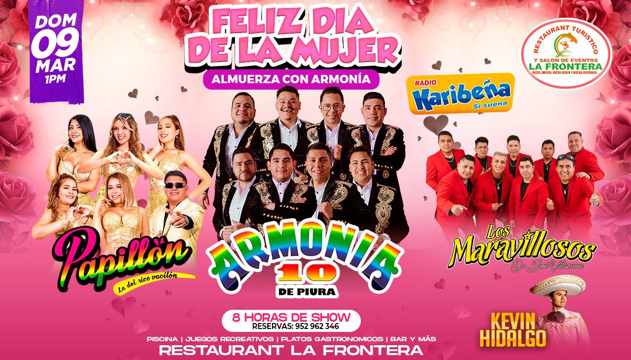 En el Restaurante La Frontera por el Día Internacional de la Mujer la celebración será amenizada por Papillón, Armonía 10 y Los Maravillosos. Comienza a la 1 PM. Resevas de mesa al whatsapp +51952962346.