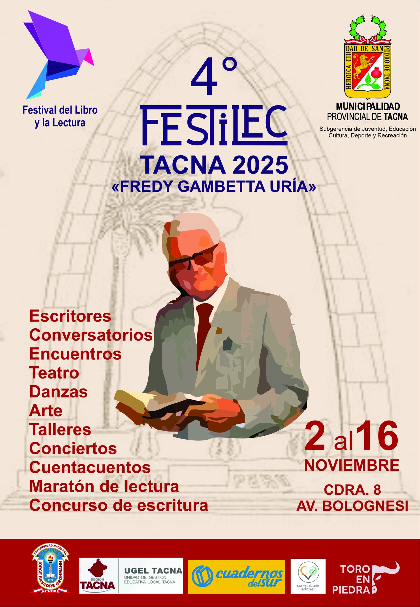 • 4° Festilec Tacna 2025 «Fredy Gambetta Uría» del 2 al 16 de noviembre en la cuadra 8 de la Av. Bolognesi. Conversatorios, danzas, teatro, cuentacuentos, concursos, maratón de lectura, venta de libros… Informes al festilecperu@gmail.com.