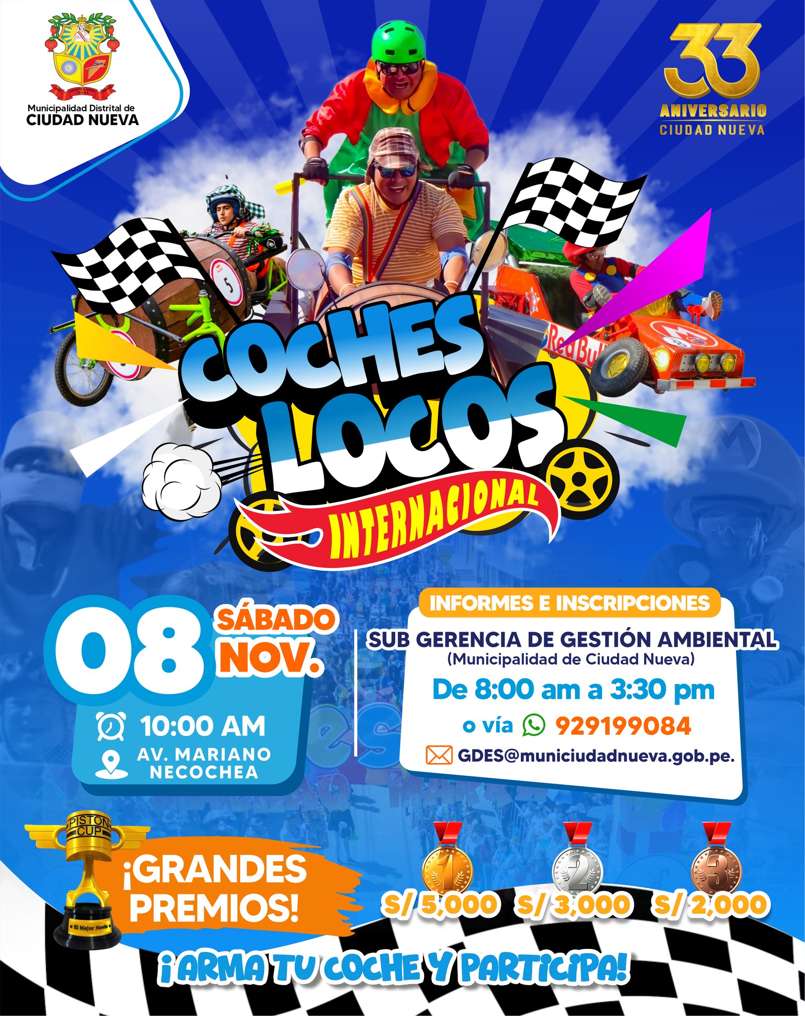 • Coches Locos Internacional organizado por la Municipalidad Distrital de Ciudad Nueva. Se realizará en la Av.Mariano Necochea a las 10:00 AM. Premios de S/2 mi, S/ 3 mil y S/ 5 mil. Informes e inscripciones en la Sub Gerencia de Gestión Ambiental de la nunicipalidad distrital, al 929199084 o al e-mail GDES@municiudadnueva.gob.pe.