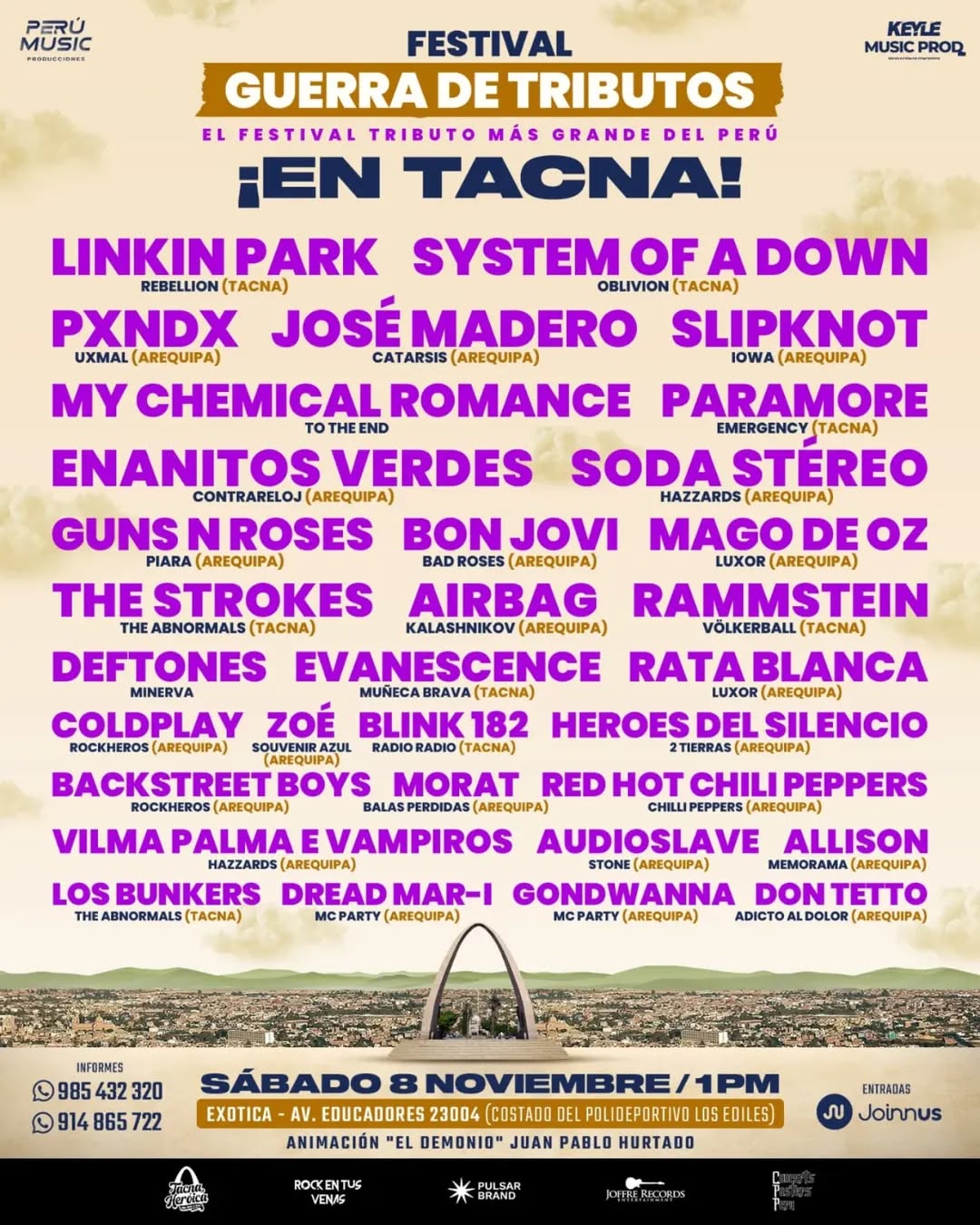 • Festival Guerra de Tributos con más de 30 bandas en escena tocando la música de igual número de artistas consagrados. Se realizará en Exótica (Av. Los Educadores, costado Polideportivo Los Ediles) a la 1:00 PM. Informes al 914865722, entradas a la venta en Joinnus.