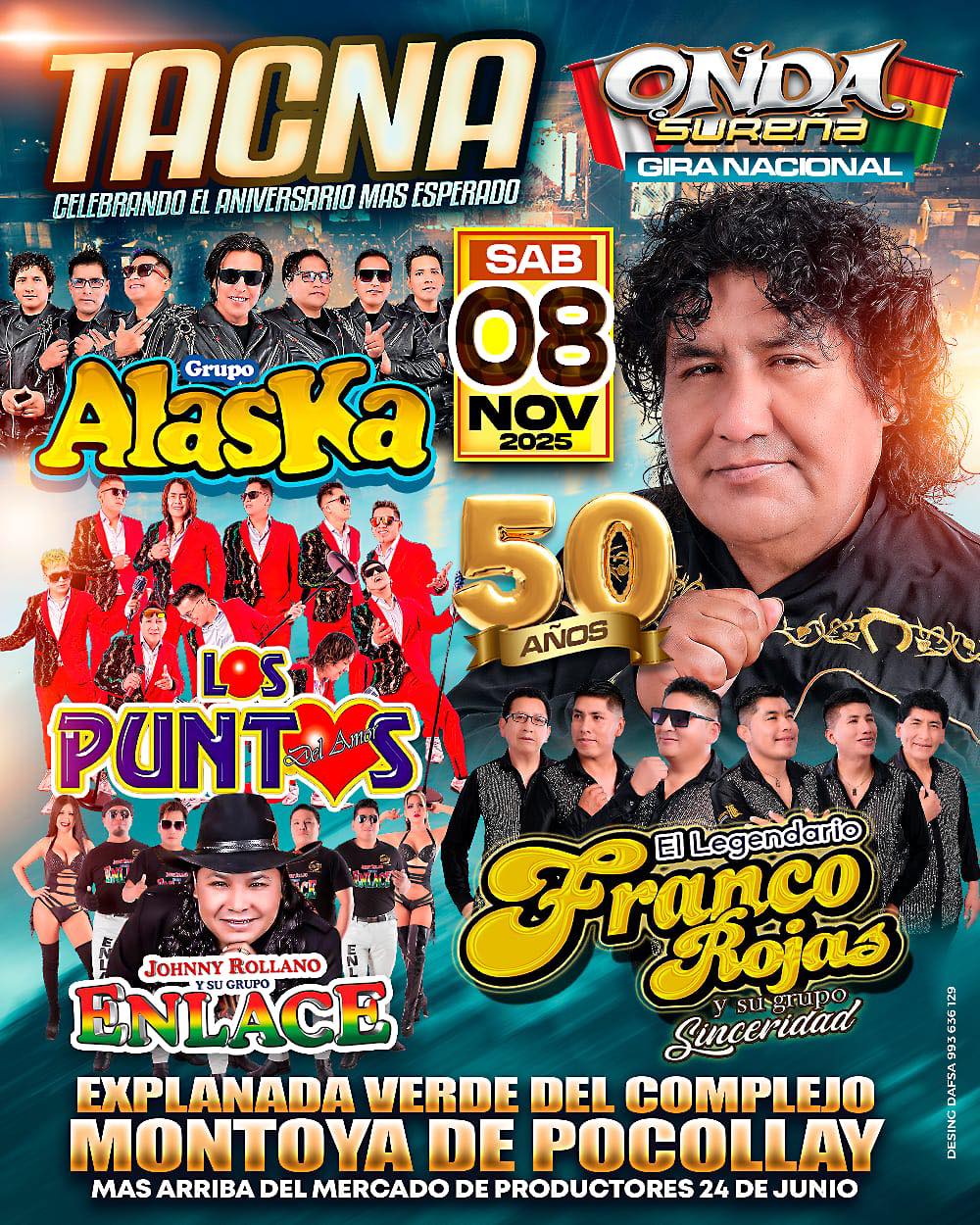 • Onda Sureña Gira Nacional en la explanada verde del Complejo Montoya de Pocollay (más arriba del Mercado de Productores 24 de Junio). Se presentarán el Grupo Alaska, Los Puntos del Amor, Johnny Rollano y su Grupo Enlace y celebrando sus 50 años Franco Rojas y su Grupo Sinceridad.