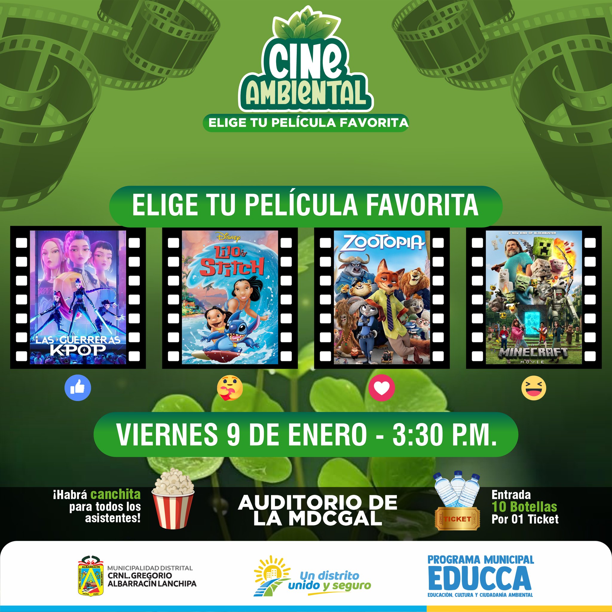 Cine Ambiental en el Auditorio de la Municipalidad Distrital Coronel Gregorio Albarracín Lanchipa desde las 3:30 PM. La estrada es 10 botellas de plástico. La película a elegir se decidirá acá.