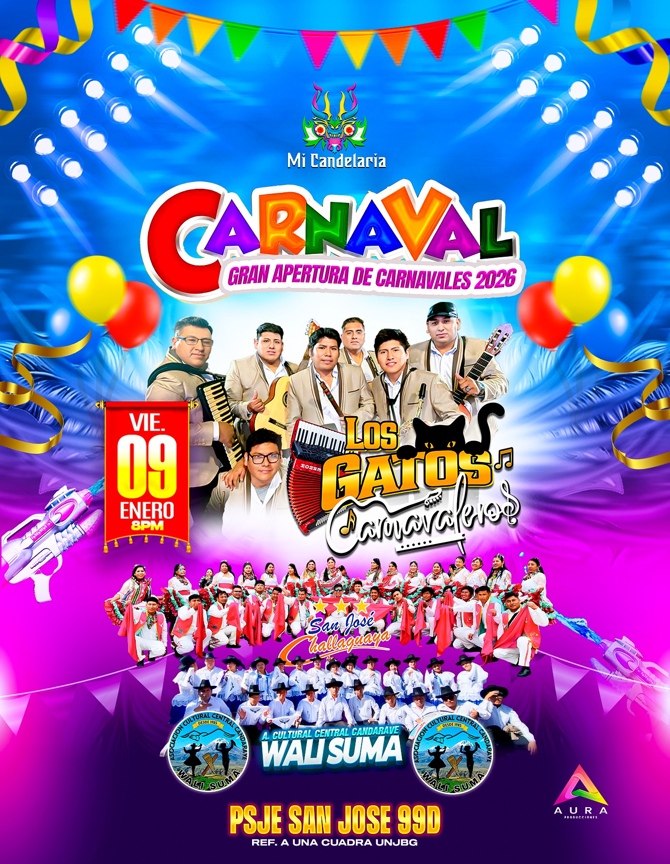 Gran Apertura de Carnavales en el local Mi Candelaria (psje. San José N° 99D), desde las 8:00 PM. Se presentan Los Gatos Carnavaleros, Tarkada Central Candarave Wali Suma, y Comparsa San Jose de Challaguaya. Reservas al 952 672 288.