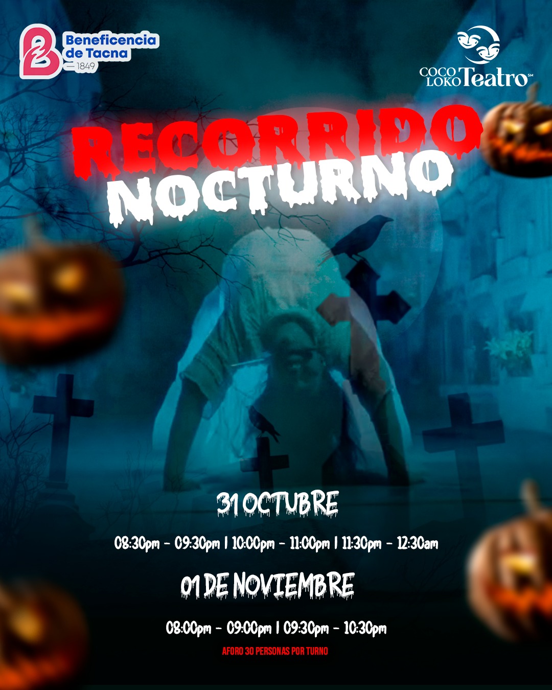 Recorrido Nocturno en el Cementerio General de Tacna, organizado por la Beneficencia de Tacna y Cocoloko Teatro. Horarios: 8:30 PM, 10:00 PM y 11:30 PM. Entradas a S/ 40 en calle Zela N° 426 y el mismo cementerio.